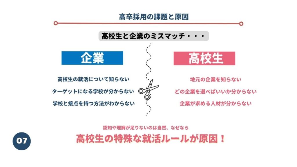多くの生徒は、進路指導のもとで初めて本格的な就職活動を経験し、自身で企業情報を幅広く収集・比較する機会も限定されています。