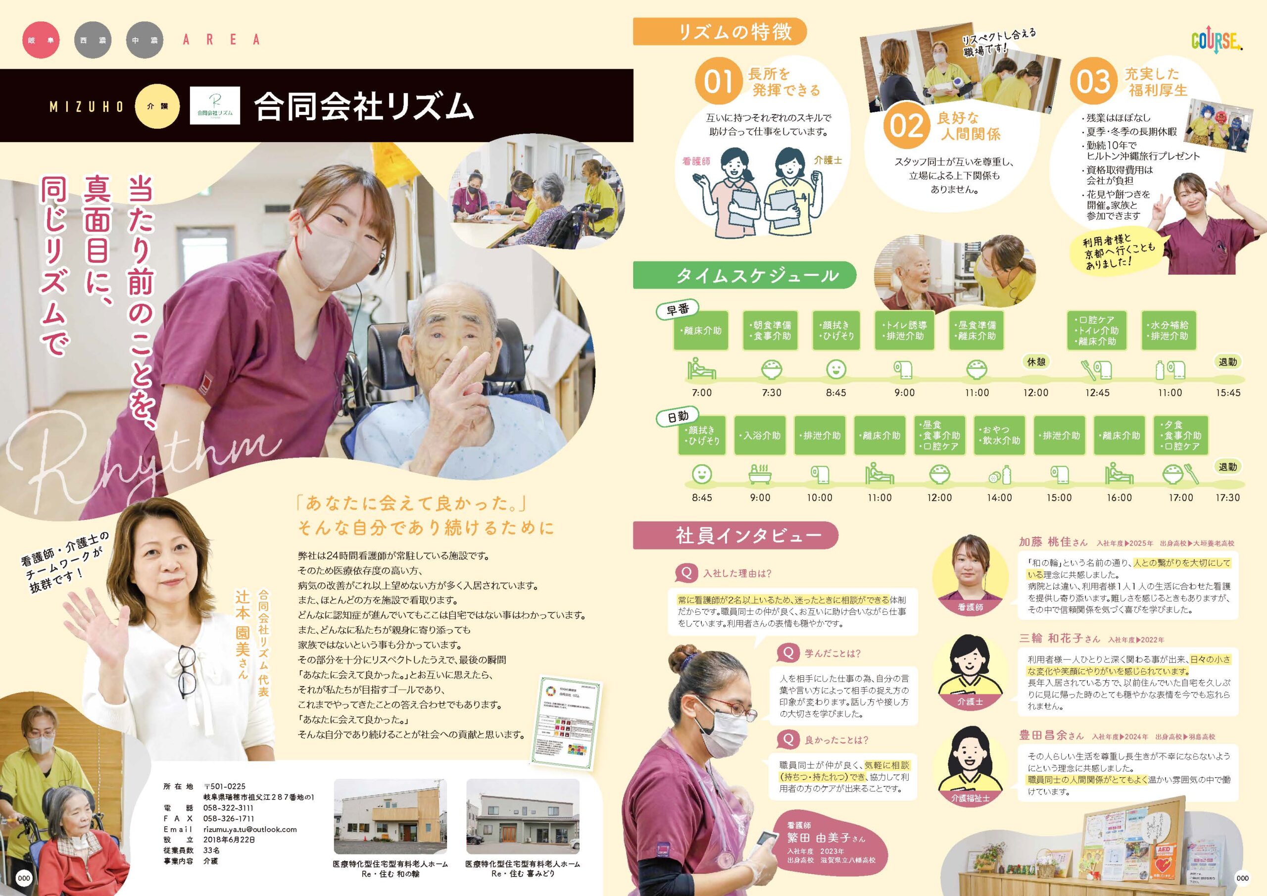今回の誌面制作では、介護の仕事内容を説明するよりも、現場で働く「人」に焦点を当てて制作しました。社員一人ひとりが持つ長所や役割が重なり合い、支え合いながら働く様子が伝わるよう、全体を柔らかなトーンで構成しています。写真や余白を活かし、高校生が無理なく読み進めながら、働く姿を身近に感じられる誌面を目指しました。